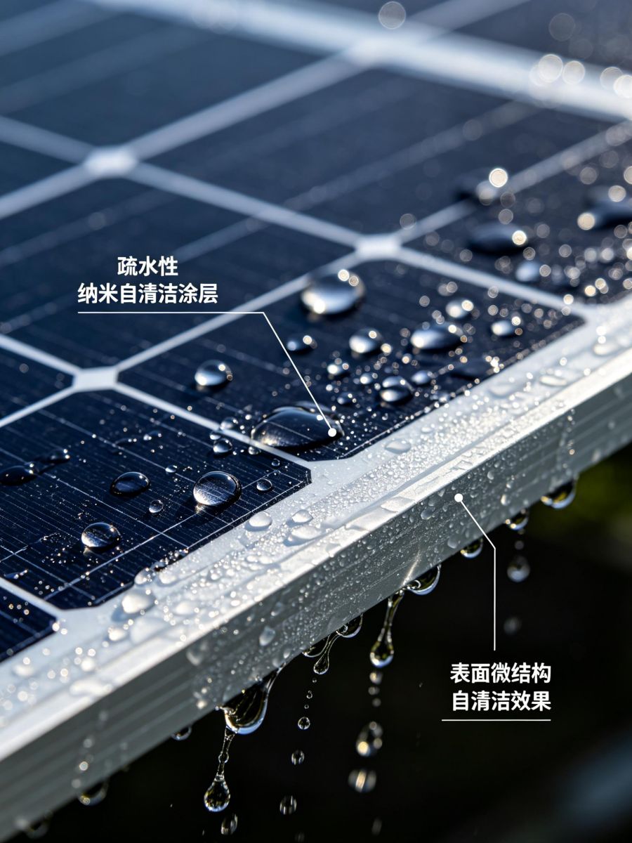 微纳结构实现超疏水,水滴带走灰尘,提升光伏板自清洁力。