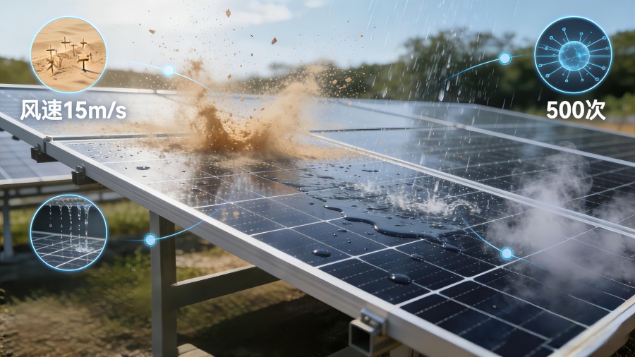 利用重力与风力实现零能耗清洁。倾斜安装的光伏板在疏水涂层作用下,3°以上坡度即可触发水滴自主滚落。滚落过程产生“扫帚效应”,通过物理冲刷剥离污染物。实验表明,2mm/min的降雨强度即可清除90%以上浮尘,大幅降低运维成本,保障长期发电效率。