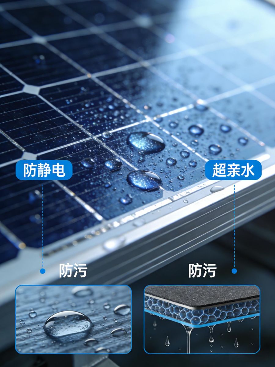 涂层固化后形成一层致密的低摩擦系数保护膜,具有优异的防静电性能。它能中和或阻断表面电荷的积聚,使光伏玻璃表面不易因静电吸附带正电或负电的微小尘埃颗粒。这从源头上减少了灰尘在光伏板表面的附着能力,大大延长了人工清洗的周期,降低了光伏电站的运维成本和人力负担。