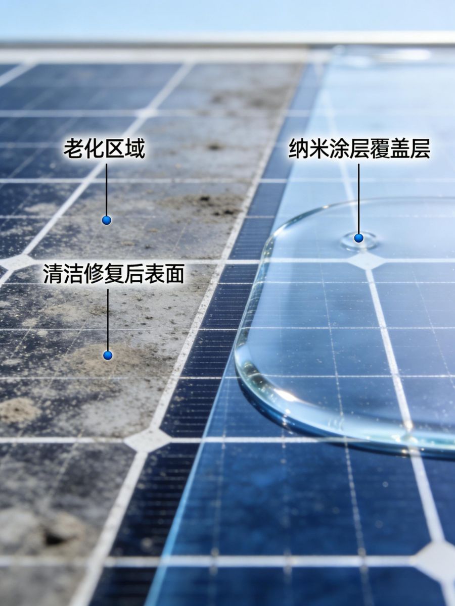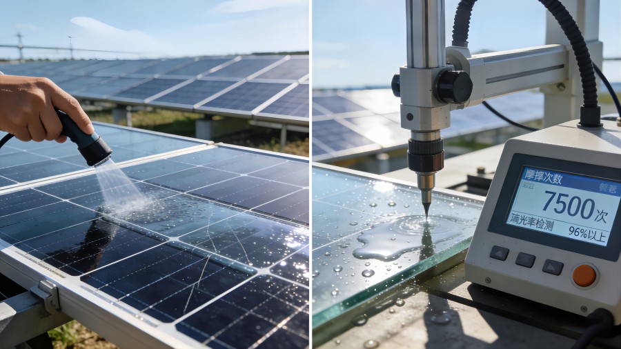 采用无机纳米复合结构,通过化学键合与玻璃基材形成牢固界面,耐酸碱、抗盐雾、抗紫外线老化,经7500次机械摩擦测试后透光率仍保持96%以上。涂层寿命可达15年,全程维持亲水性与光催化活性,保障光伏组件全生命周期发电效率稳定提升3.5%–6%。