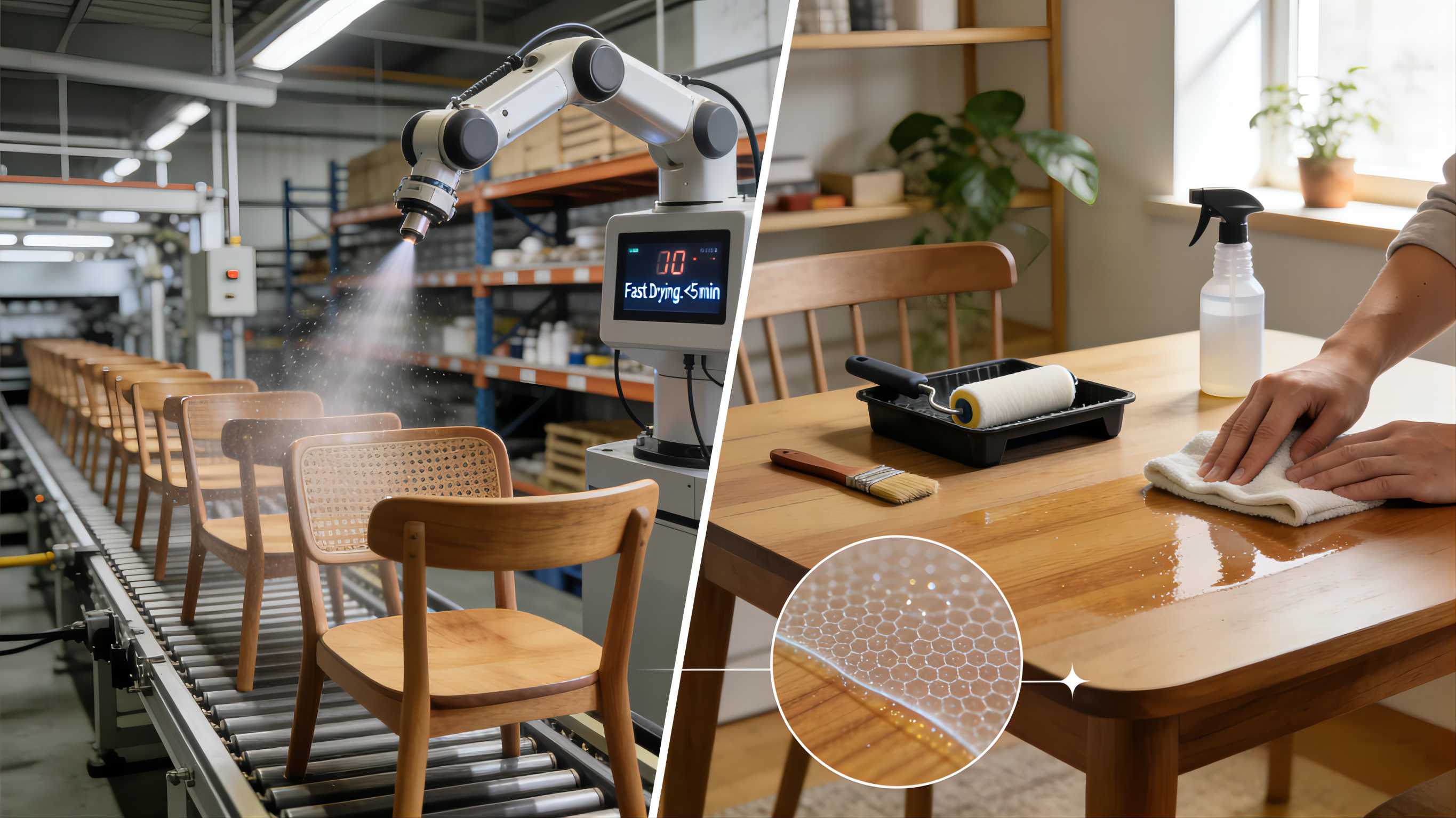 采用先进的纳米杂化技术,该涂层在常温下仅需极短时间即可表干,大幅缩短施工等待期。施工方式简单灵活,无论是喷涂、擦涂还是辊涂,都能轻松上手。既适合家具厂流水线批量作业,也适用于家庭DIY日常维护,无需专业工具,自己动手就能为心爱的家具增添一层专业级的防护。