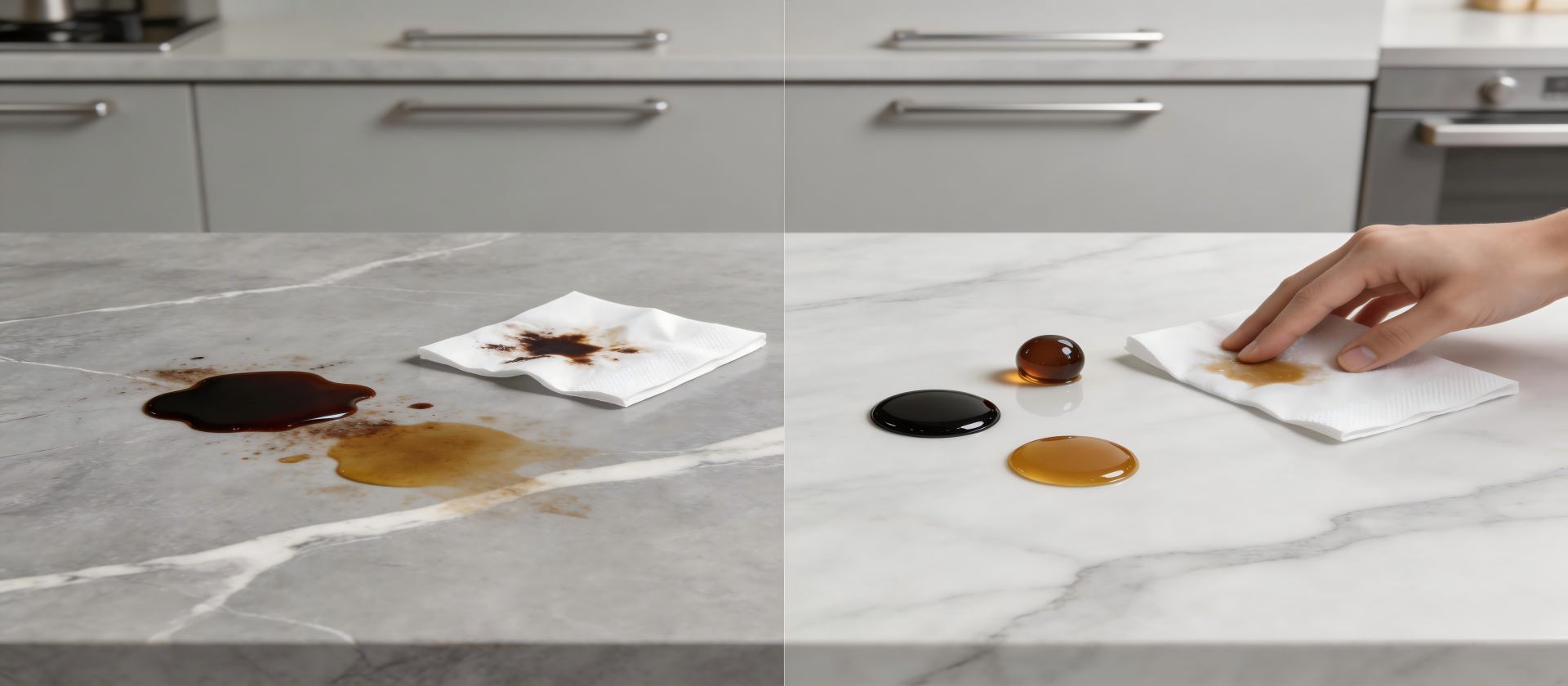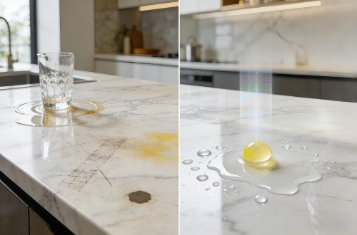 涂层固化后透光率极高,不会在石材表面形成视觉可见的塑料胶面感。它完全保留了大理石天然的纹理细节与人造石的通透质感,实现“零触感”防护。不仅不会改变石材原有的色泽与光泽度,还能防止基材因日常磨损而发白或失光。