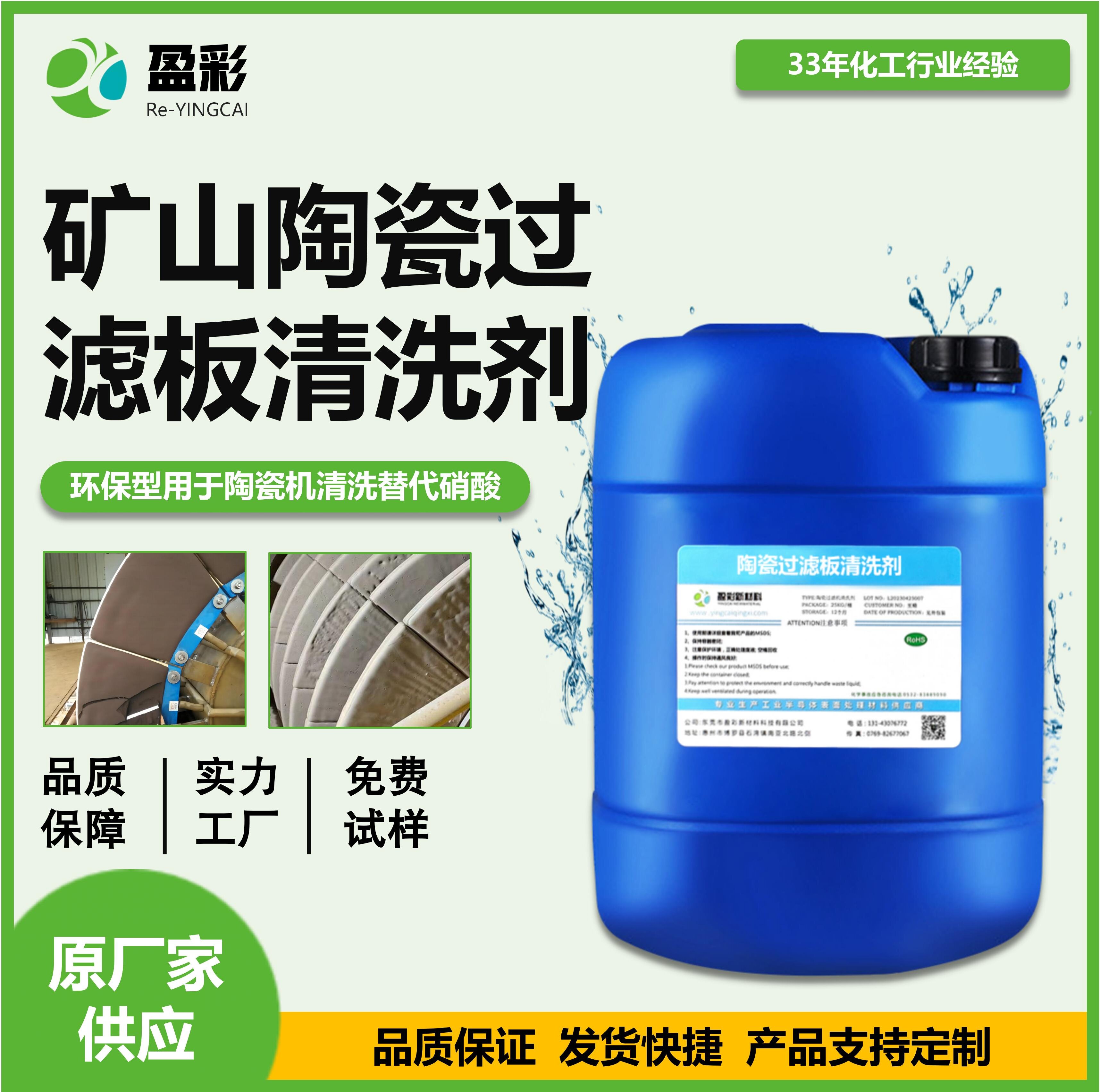 Re-yingcai®钒矿陶瓷过滤板清洗剂 Re-yingcai®钒矿陶瓷过滤板清洗剂高效去污,保护滤板。