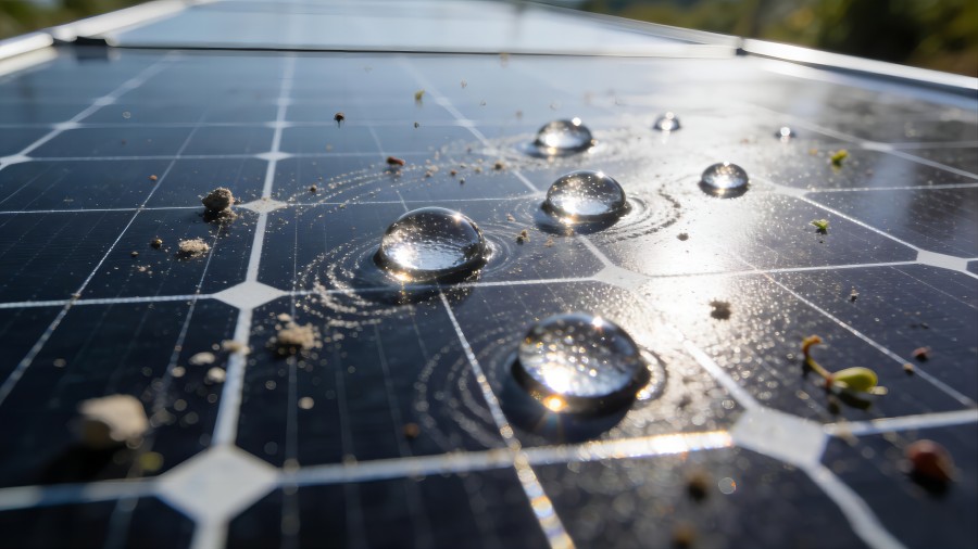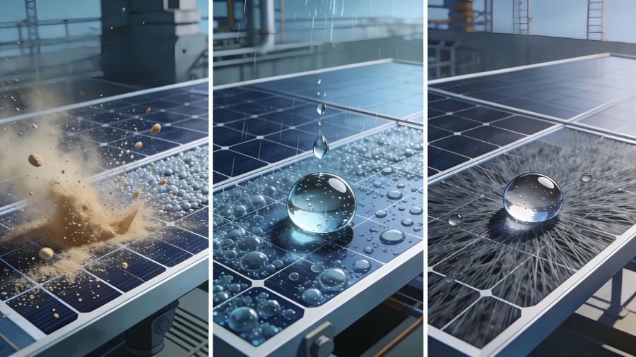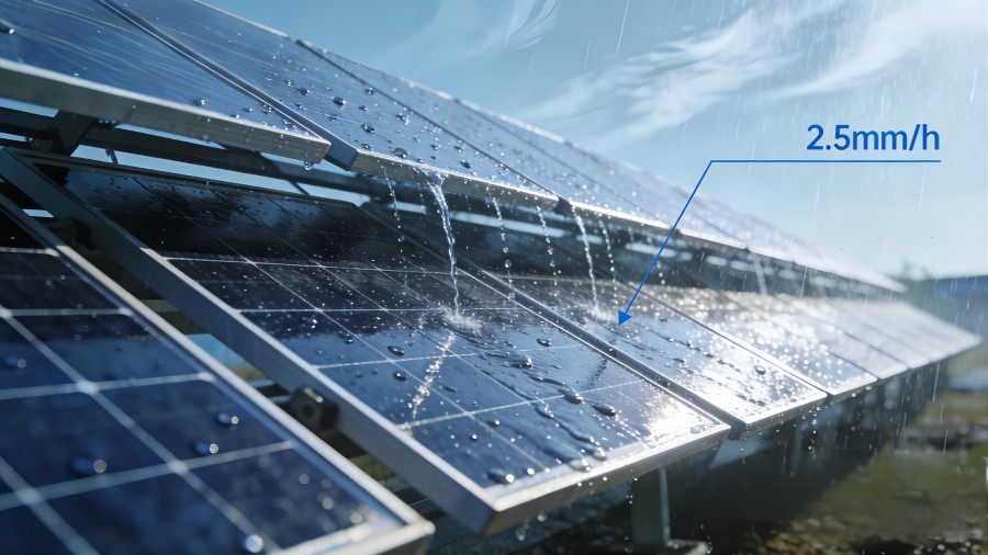 利用重力与自然风力实现完全被动式清洁。组件倾角≥5°时,3mm直径水滴能以0.2m/s速度滚落,形成"微冲刷"效应。实测表明2.5mm/h降雨强度下,组件表面灰垢清除率可达92%,年运维成本降低40%,尤其适应分布式电站的无人化运维场景。